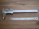 | 画像の上がノギスで、下がスケールといいます。 下は、ステンレスの定規です。 一本は持っておいたほうがいいと思います。 使い方は、普通の定規となんら変わりはありません。 ノギスですが、丸物の外径・内径・厚み・深さ・などを計測することが出来る大変便利なものです。 計測単位は0.1mm単位で、見ようによっては0.05mmくらいなら読むことは可能です。 |